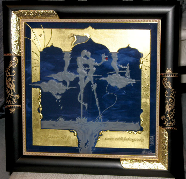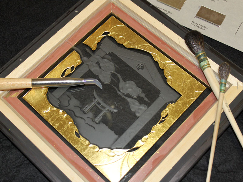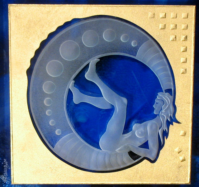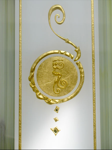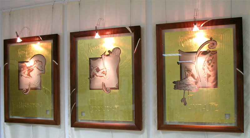 The gilding of glass in combination with his deep sandblasting is the most outstanding distinguishing feature of glass artist Jens Banerjee, for which he was awarded the "Deutscher Innovationspreis" (German Prize of Innovation) by the "Bundesverband der Deutschen Glasveredler" (German association of craftsmen and artists specialized in glass refinement). With a leaf gilding of 24-carat gold the glass refinement, an impressive process in itself, receives exactly the rank of quality that makes his glass refinement in combination with deep sandblasting unique.