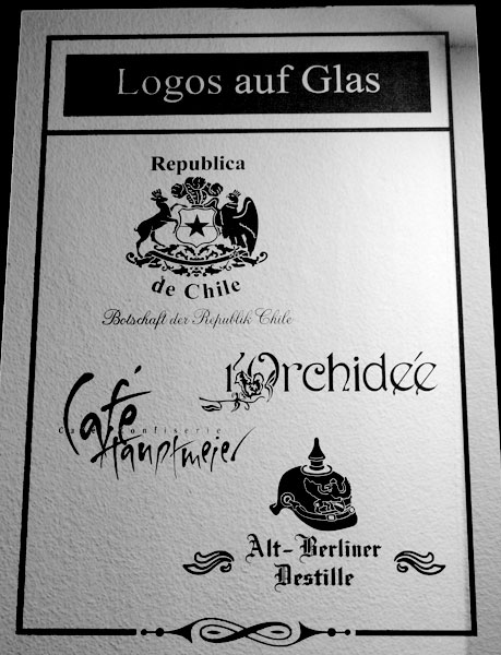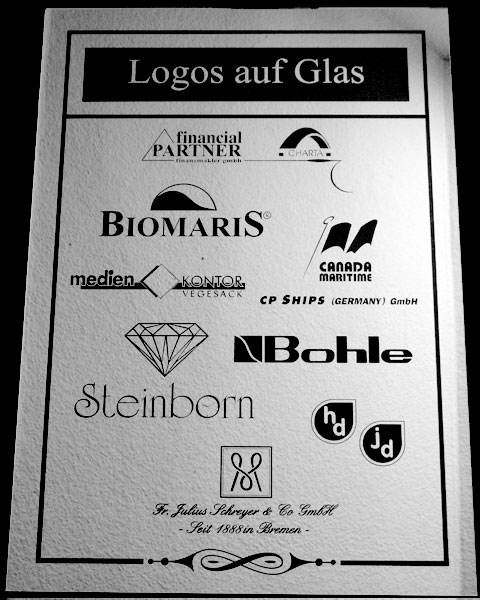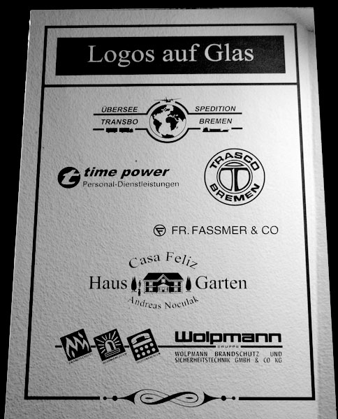 Gesandstrahlt werden Motive der Werbung und Firmenlogos, die sonst nur als Klebefolierungen bekannt sind. Individuelle Kundenideen vom Trinkglas mit Namen sowie Firmenlogos bis hin zum großen Glaswerbeschild sind möglich. Wünsche und Ideen werden detailliert besprochen und anschließend nach Kundenwunsch umgesetzt.