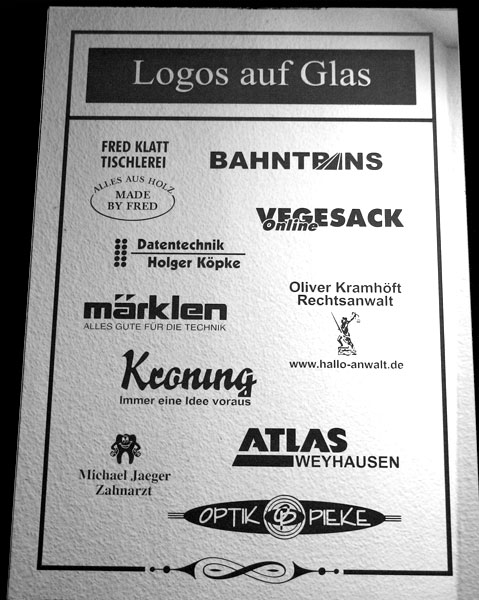 Gesandstrahlt werden Motive der Werbung und Firmenlogos, die sonst nur als Klebefolierungen bekannt sind. Individuelle Kundenideen vom Trinkglas mit Namen sowie Firmenlogos bis hin zum großen Glaswerbeschild sind möglich. Wünsche und Ideen werden detailliert besprochen und anschließend nach Kundenwunsch umgesetzt.